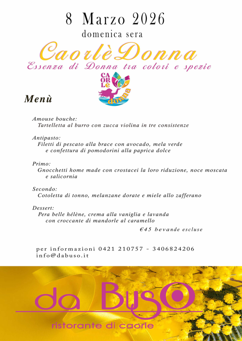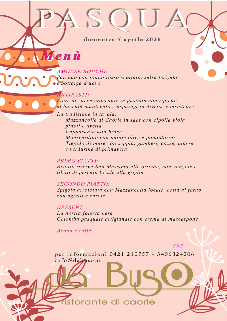 Nel 2007 la famiglia Vio ha aperto a Caorle il ristorante “da Buso” gestito da Alessandra e Andrea. Il nome del locale deriva dal soprannome dato dagli altri pescatori al nonno di Alessandra, Luigi, da allora chiamato Gigio Buso. A partire da marzo 2008 il ristorante “da Buso” è stato accolto nel Gruppo della Ristorazione Tipica Caorlotta; per coerenza a questo progetto proponiamo una cucina di pesce essenzialmente tradizionale, volta a recuperare e riproporre le ricette della tradizione caorlotta e veneziana, riscoperte non solo nei vecchi ricettari di famiglia, ma anche spulciando le antiche pubblicazioni. La nostra cucina propone ricette della tradizione, quali i Moscardini in umido, il Broeto, le Sarde in saor, ma al contempo abbiamo cercato di sperimentare nuovi abbinamenti come le crudità e i marinati abbinati alla frutta fresca di stagione, abbiamo inoltre curato nuove tecniche di cottura, come ad esempio quella in sottovuoto. Attenti alle esigenze di una clientela sempre più accorta offriamo alcuni piatti vegetariani, quale fresca alternativa al pesce. Ad adeguato corredo delle nostre preparazioni proponiamo una curata carta dei vini, in bottiglia e al calice.